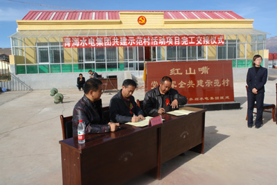 在交接儀式上,董金明書記等領(lǐng)導(dǎo)對(duì)聯(lián)建項(xiàng)目給予了高度的評(píng)價(jià),并對(duì)青海水電集團(tuán)領(lǐng)導(dǎo)多次深入村莊調(diào)查研究、了解村情民意,根據(jù)村莊發(fā)展長(zhǎng)遠(yuǎn)規(guī)劃,從實(shí)際需求出發(fā)制定聯(lián)建項(xiàng)目等一系列做法表示崇高的敬意和衷心的感謝。同時(shí),他希望兩村村民借助聯(lián)建的強(qiáng)大動(dòng)力,進(jìn)一步加大改善村容、環(huán)境衛(wèi)生等工作,維護(hù)好、管理好聯(lián)建項(xiàng)目設(shè)施。尹京輝同志在致辭中表示,全縣群眾將永遠(yuǎn)銘記黨和政府的恩情,不辜負(fù)黨和政府給予的各項(xiàng)惠農(nóng)政策,艱苦創(chuàng)業(yè),勤勤懇懇、安居樂業(yè),為建設(shè)社會(huì)主義新農(nóng)村,維護(hù)青海社會(huì)穩(wěn)定,經(jīng)濟(jì)發(fā)展做出貢獻(xiàn)。青海水電集團(tuán)計(jì)劃投資部副部長(zhǎng)李宏緒和紅山嘴村代表以及監(jiān)交方青石嘴鎮(zhèn)政府領(lǐng)導(dǎo)簽訂了交接協(xié)議書。村民代表向青海水電集團(tuán)贈(zèng)送了致謝錦旗。