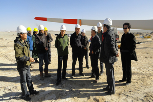 在茫崖一期20兆瓦風(fēng)電場(chǎng)建設(shè)工地,集團(tuán)領(lǐng)導(dǎo)察看了已完成吊裝的首臺(tái)風(fēng)機(jī),并聽(tīng)取了茫崖風(fēng)電有限公司總經(jīng)理支永新和工程承包方代表關(guān)于施工組織、設(shè)備安裝和調(diào)試等情況的介紹,觀(guān)看了第二臺(tái)風(fēng)機(jī)機(jī)艙的吊裝施工,檢查了正在施工中的110KV變電所、高壓線(xiàn)路、綜合樓。王海青、姚鐵兵代向建設(shè)一線(xiàn)的同志們贈(zèng)送了慰問(wèn)品,對(duì)他們的辛勤付出表達(dá)了敬意和感謝。王總經(jīng)理指出,茫崖風(fēng)電場(chǎng)2.5兆瓦風(fēng)電機(jī)組是目前省內(nèi)海拔最高、單機(jī)容量和葉輪直徑最大的機(jī)組,也是青海水電集團(tuán)獨(dú)立開(kāi)發(fā)的第一個(gè)風(fēng)電項(xiàng)目,對(duì)集團(tuán)新能源業(yè)務(wù)的發(fā)展具有重大意義。各參建單位要高度重視,同心協(xié)力,克服自然條件艱苦等不利因素,在確保安全和質(zhì)量的前提下,加快工程進(jìn)度,并及時(shí)辦理并網(wǎng)許可等前期手續(xù),爭(zhēng)取早日投產(chǎn)發(fā)電。