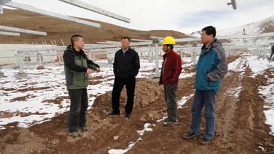 王總經(jīng)理抵達玉樹后,首先前往金太陽2兆瓦水光互補發(fā)電項目工地,對工程形象進度、設(shè)備到貨及安裝就位、職工生活情況,特別是目前工程建設(shè)所面臨的困難等做了全面深入的了解。王總經(jīng)理要求青海玉能電力開發(fā)有限公司克服氣候寒冷等不利因素,合理調(diào)配資源,增加安裝施工人員,保證各類材料設(shè)備及時到貨,加快項目建設(shè)進度,確保實現(xiàn)年底投產(chǎn)發(fā)電目標。隨后,王總經(jīng)理一行又來到禪古水電站大壩檢查,詳細詢問了庫區(qū)來水情況,要求玉樹電力公司高度重視水庫運行和安全保障工作。